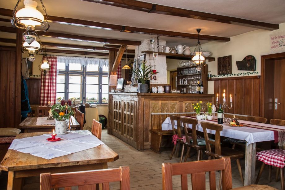 Der Gastraum strahlt mit seinen 70 Jahren alten Holztischen eine gemütliche Atmosphäre aus. Liebevoll dekoriert von unserer Wirtin fühlt man sich hier sofort wohl während der alte Holzboden knachertst.